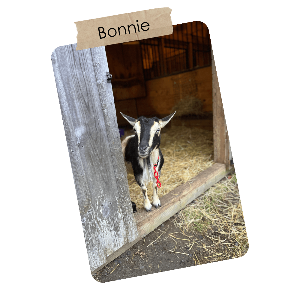 Bonnie is a Nigerian Dwarf goat and was our first milk goat. She is 10 years old and we have tentatively decided to retire her to live out her best life.